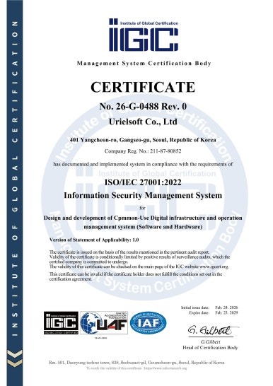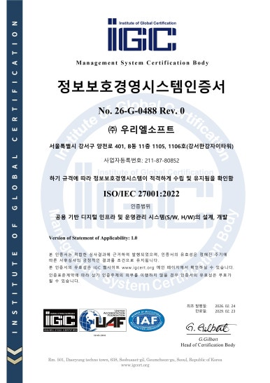 우리엘소프트가 2026년 2월 24일 IGC의 인증심사를 거쳐 정보보호 관리체계 국제표준인 ISO/IEC 27001 인증을 획득하였습니다.